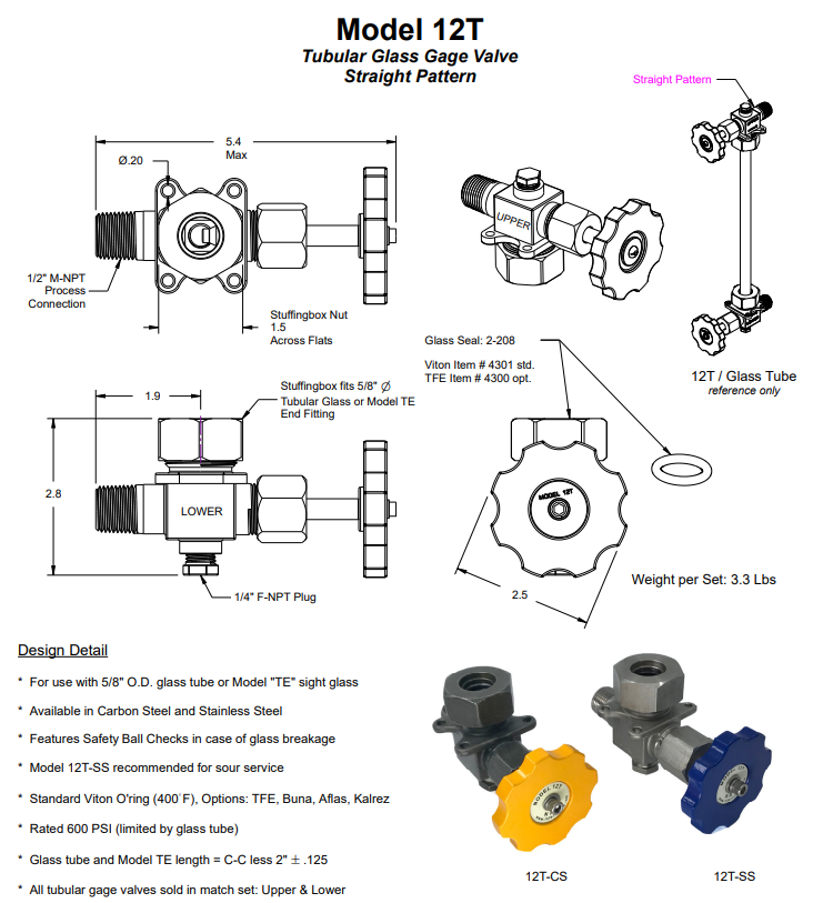 Carbon steel or stainless steel gage valves for 5/8" O.D. glass tube or model TE armored tubular sight glass